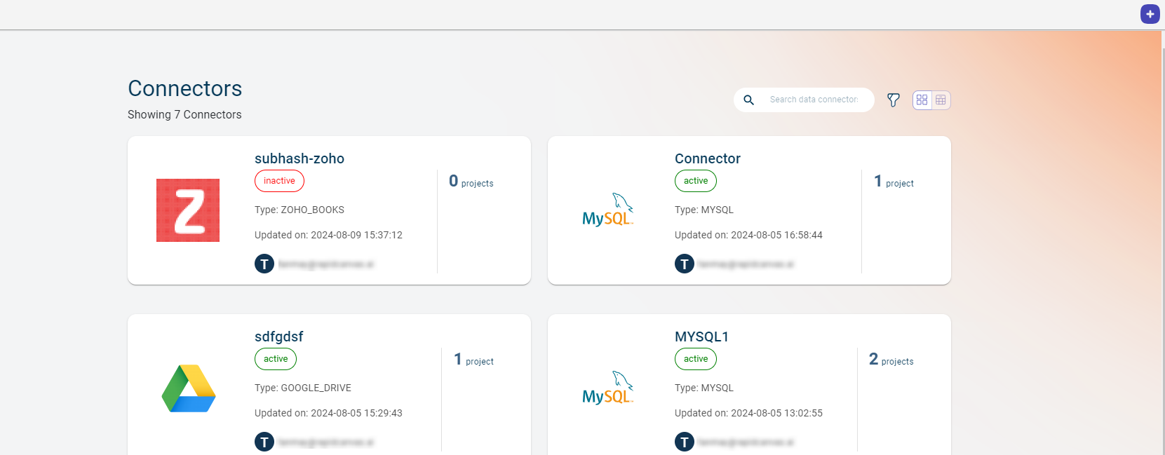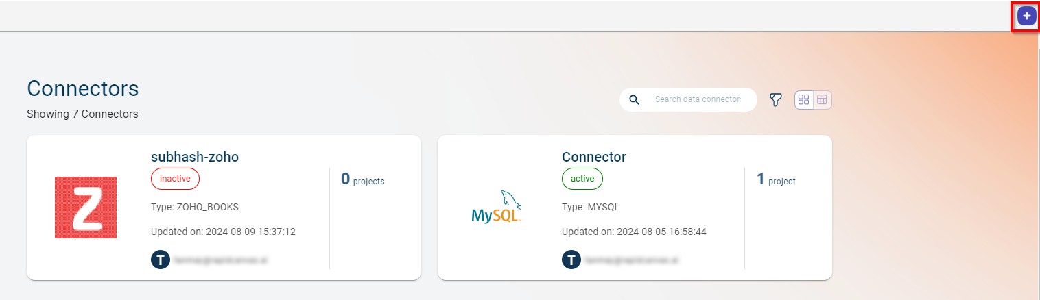 This is the page you view when you click on Data connectors from the left navigation. The page allows you to quickly access the list of Data connectors available under this tenant. On each card, you can see the total number of projects in which the data connector is used, creation date of the data connector, and source from where the data is imported.