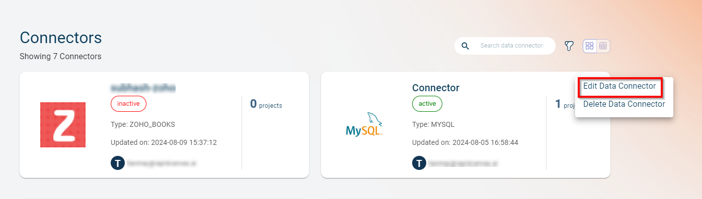 Use this procedure to modify the details of a Data connector. You can use the ellipsis icon in the card view to edit the details (or) the pencil icon corresponding to the Data connector you want to modify, in the list view.