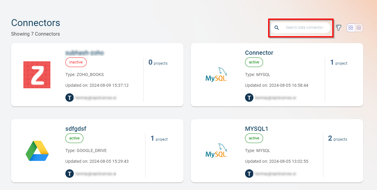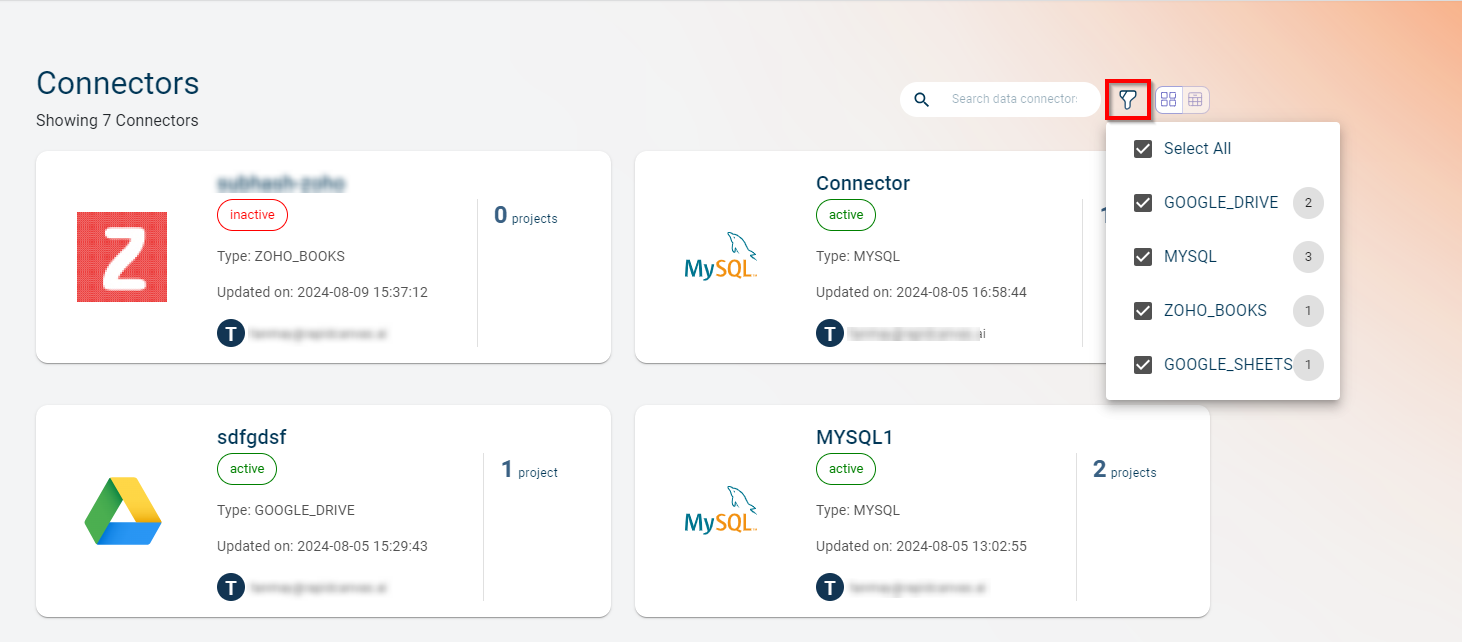 Filter: You can filter the Data connectors by type such as Google Cloud Platform (CGP), MongoDB, MySQL, Amazon S3, Azure Blob Storage, Amazon Redshift, Snowflake and Fivetran connectors. Select the check box corresponding to the Data connector that you want to filter by. Also, you can view the number of Data connectors created for each type.