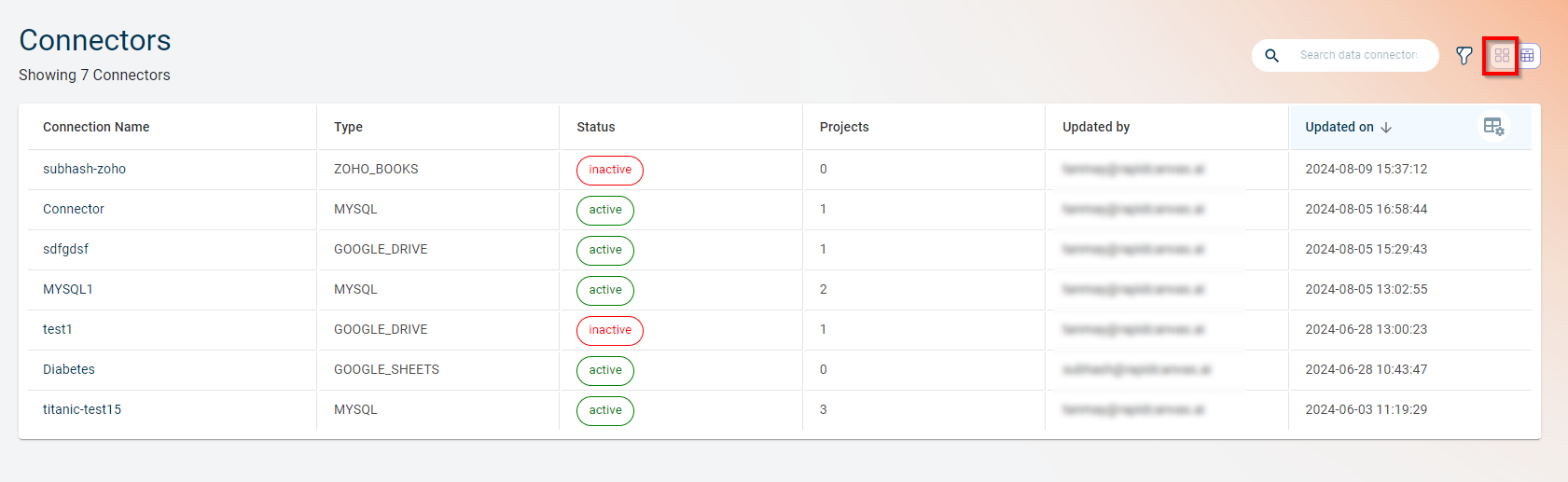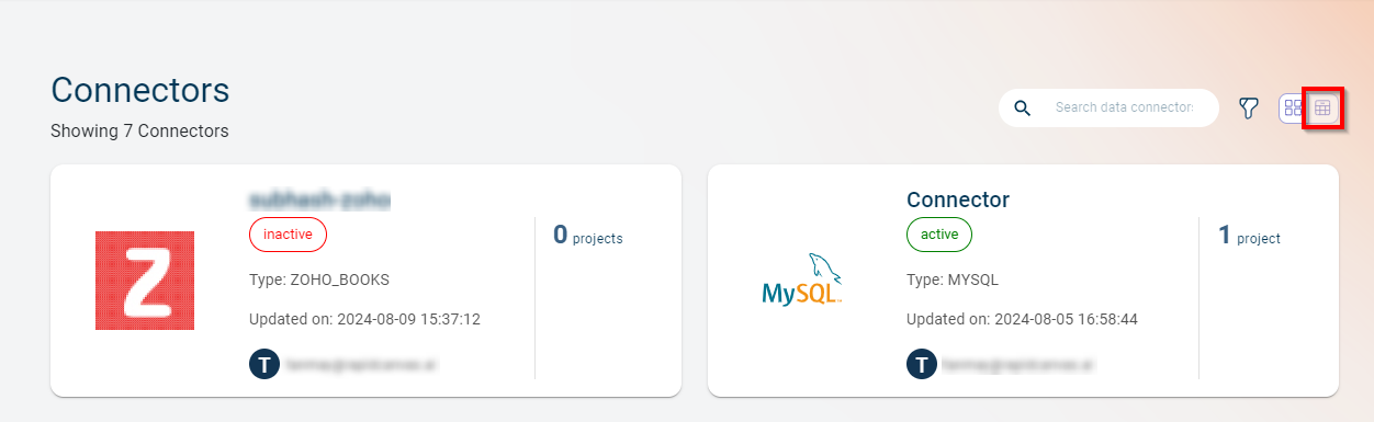 Switch from card view to list view - You can use this option to switch the Data connectors from card view to the list view.