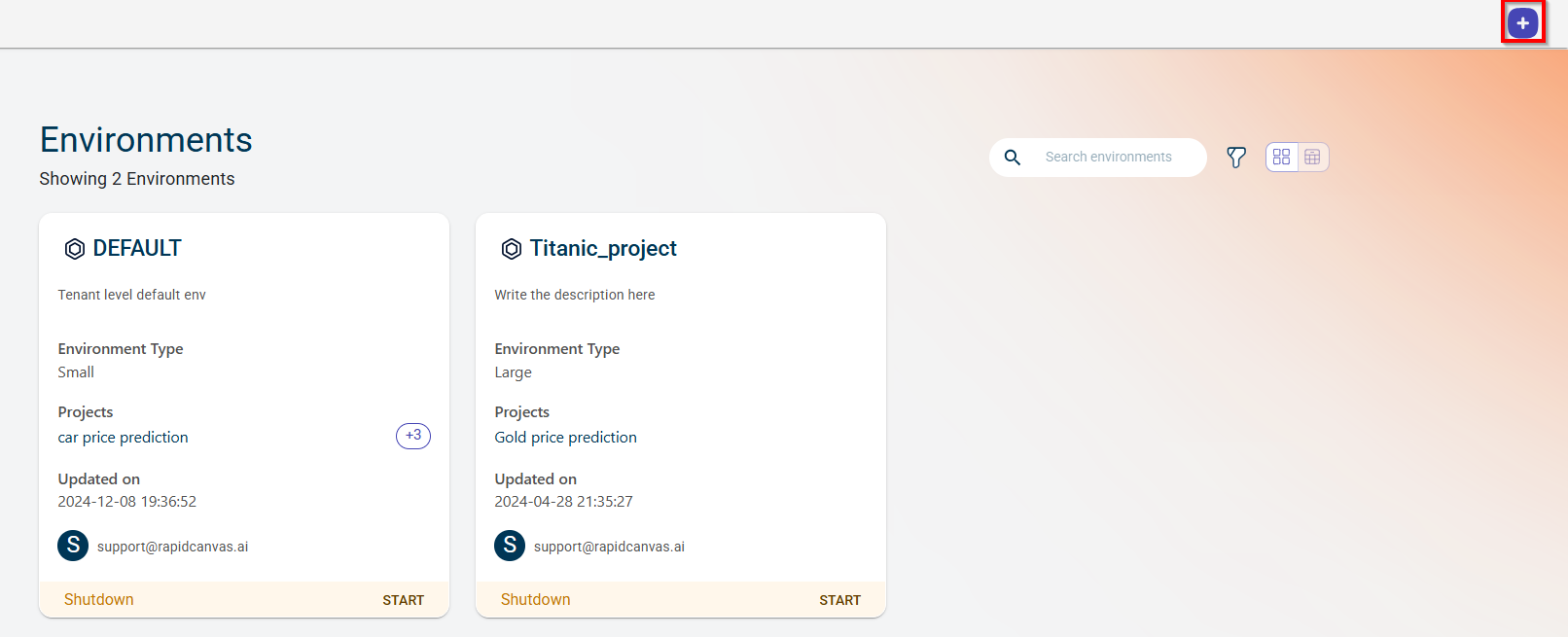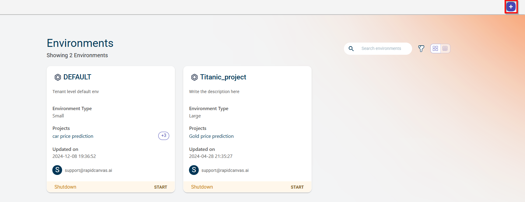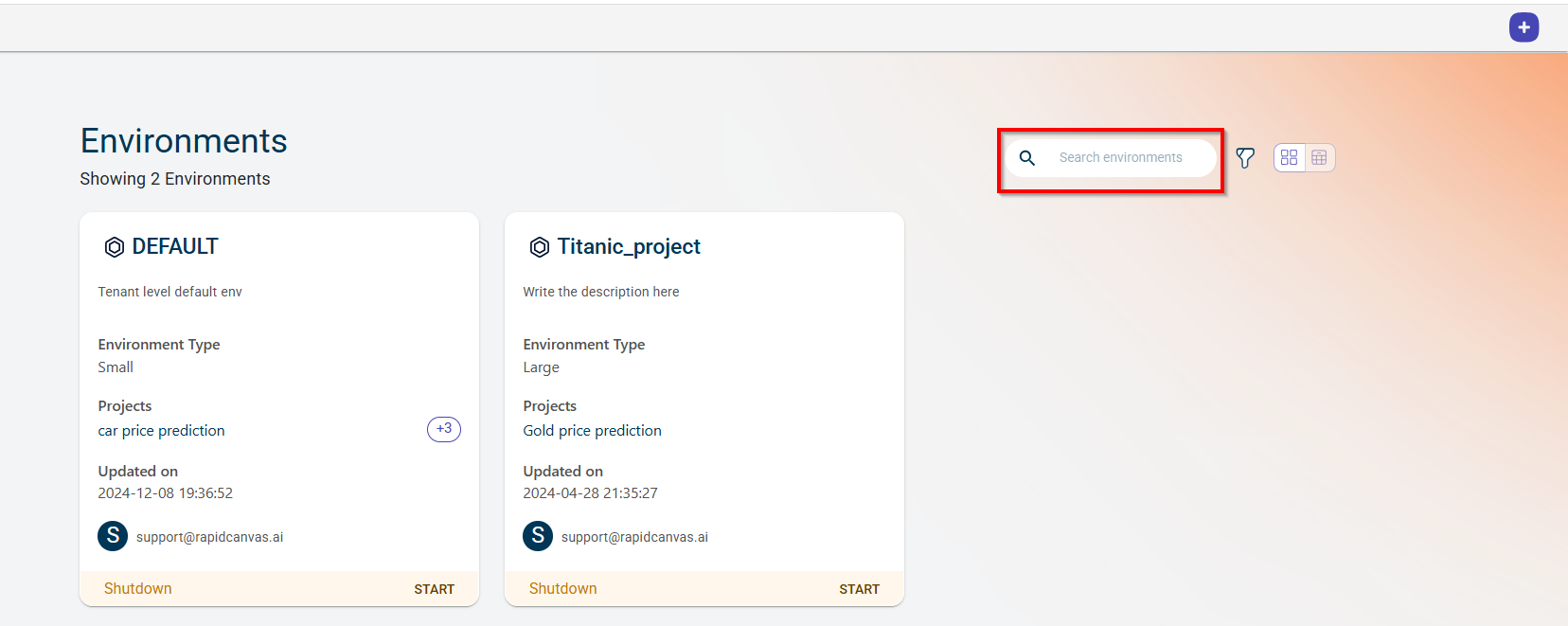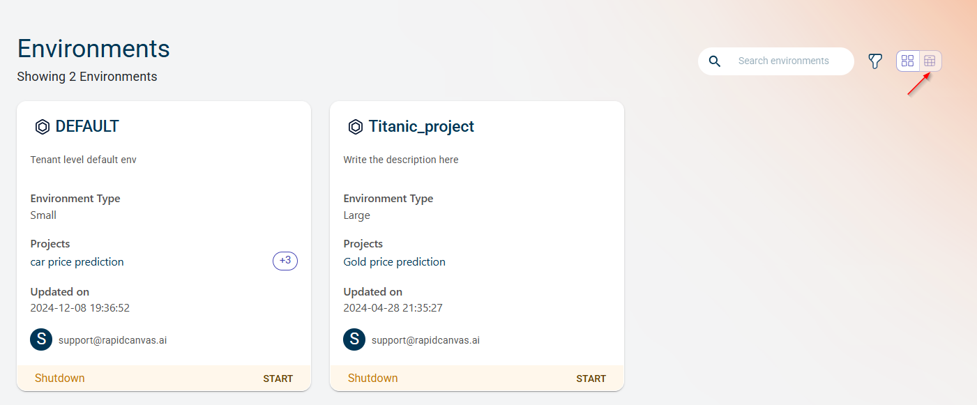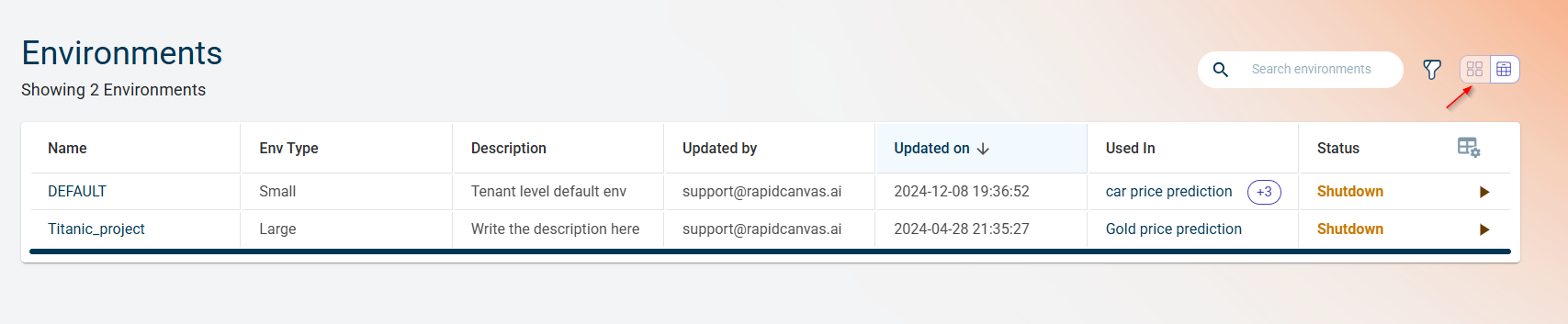 Switch from environments list view to card view: You can use this option to switch from list view to the card view.