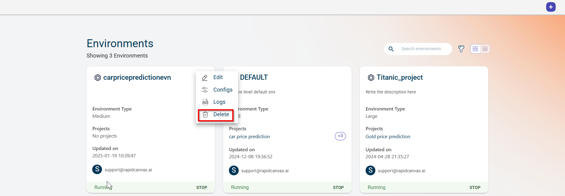 Click the ellipsis icon on the environment widget or card and select Delete.