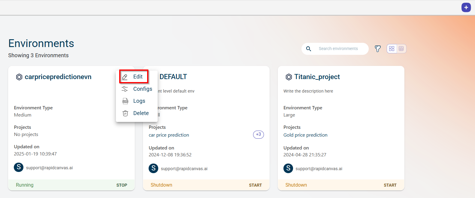 Click the ellipsis icon on the environment widget or card and select Edit.