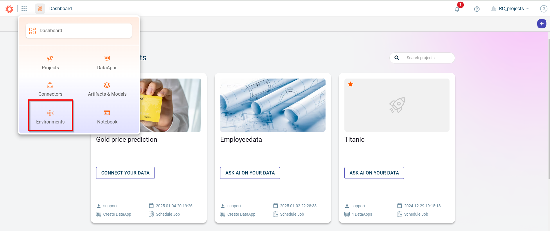 You can create multiple environments in a tenant and choose the environment in which the projects must be created. The environment offers dedicated hardware to run flows faster. In each environment, you can install different set of Python packages of different versions to run the transforms used in the flows successfully. All the environments created in the application are independent of each other. The Python and Linux libraries installed in one environment are dedicated to that environment.