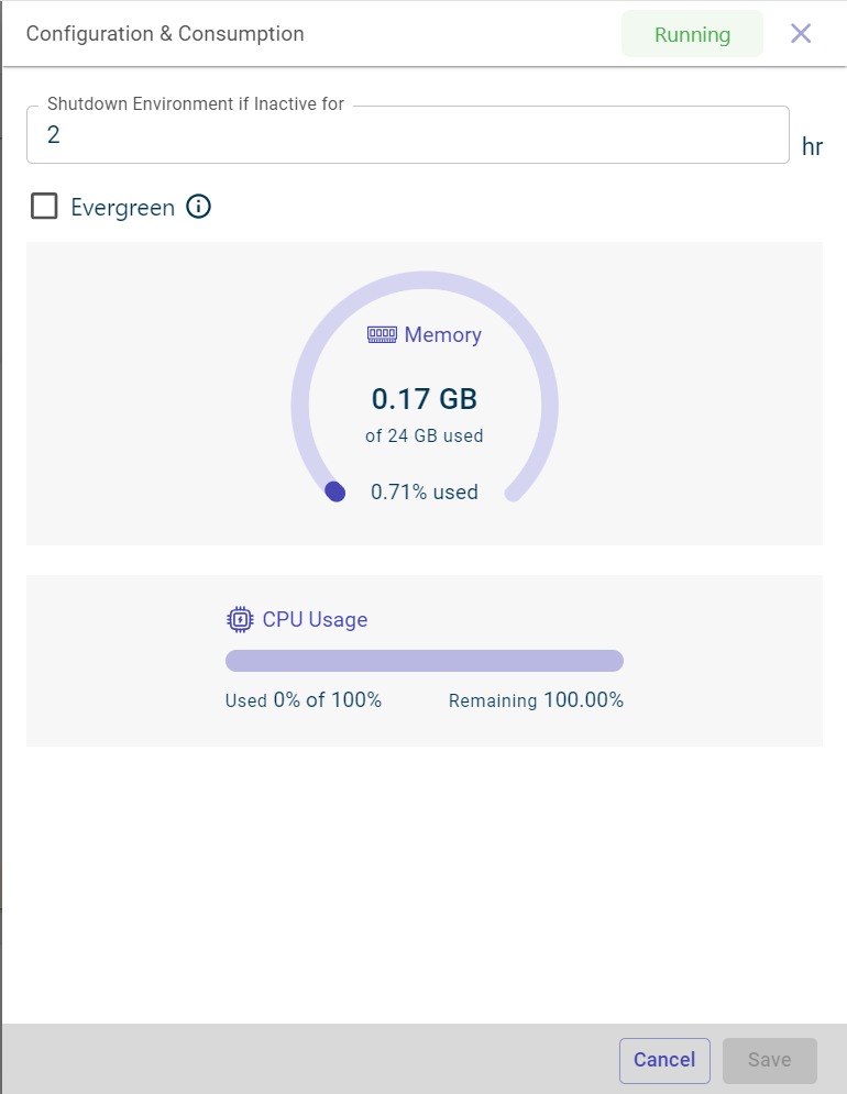 View the hardware utilization by projects running in an environment, using the Usage option. This button is disabled when the environment is shut down. You can only view the resource usage when the environment is running.