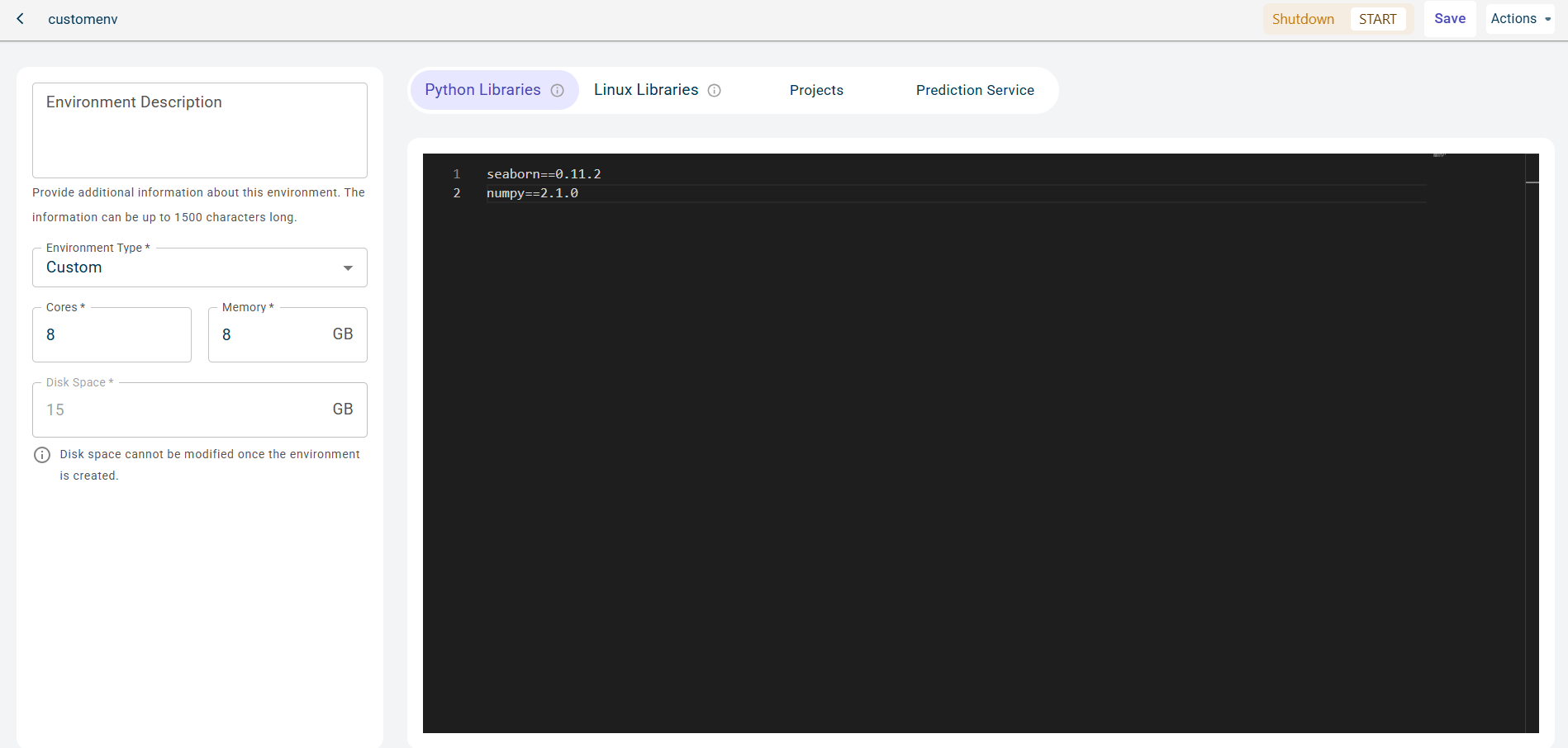 Specify the libraries you want to install in the Python Libraries and Linux Libraries tabs. You can add the Python libraries required for data transformations in the Python Libraries tab. In the Linux Libraries section, when the operating system is Linux with Python installed on top, certain libraries may not be supported by Python alone. In such cases, you can install Linux libraries to enable seamless use of Python libraries in the environment.