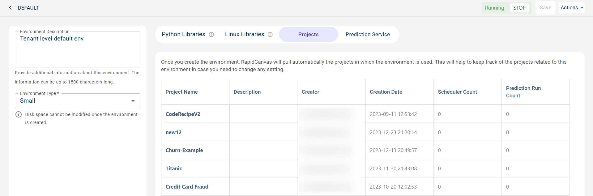 Modify the required details in the Environments page. You can also view the status of the environment on this page. If the status of the environment is running, you can use the STOP button to stop the environment.