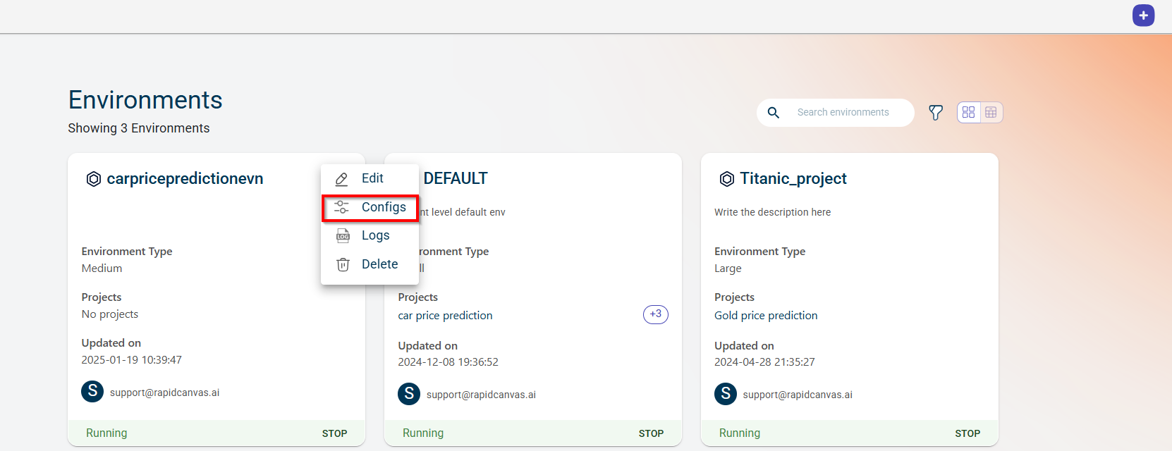 Click the ellipsis icon on the environment widget or card and select Configs.