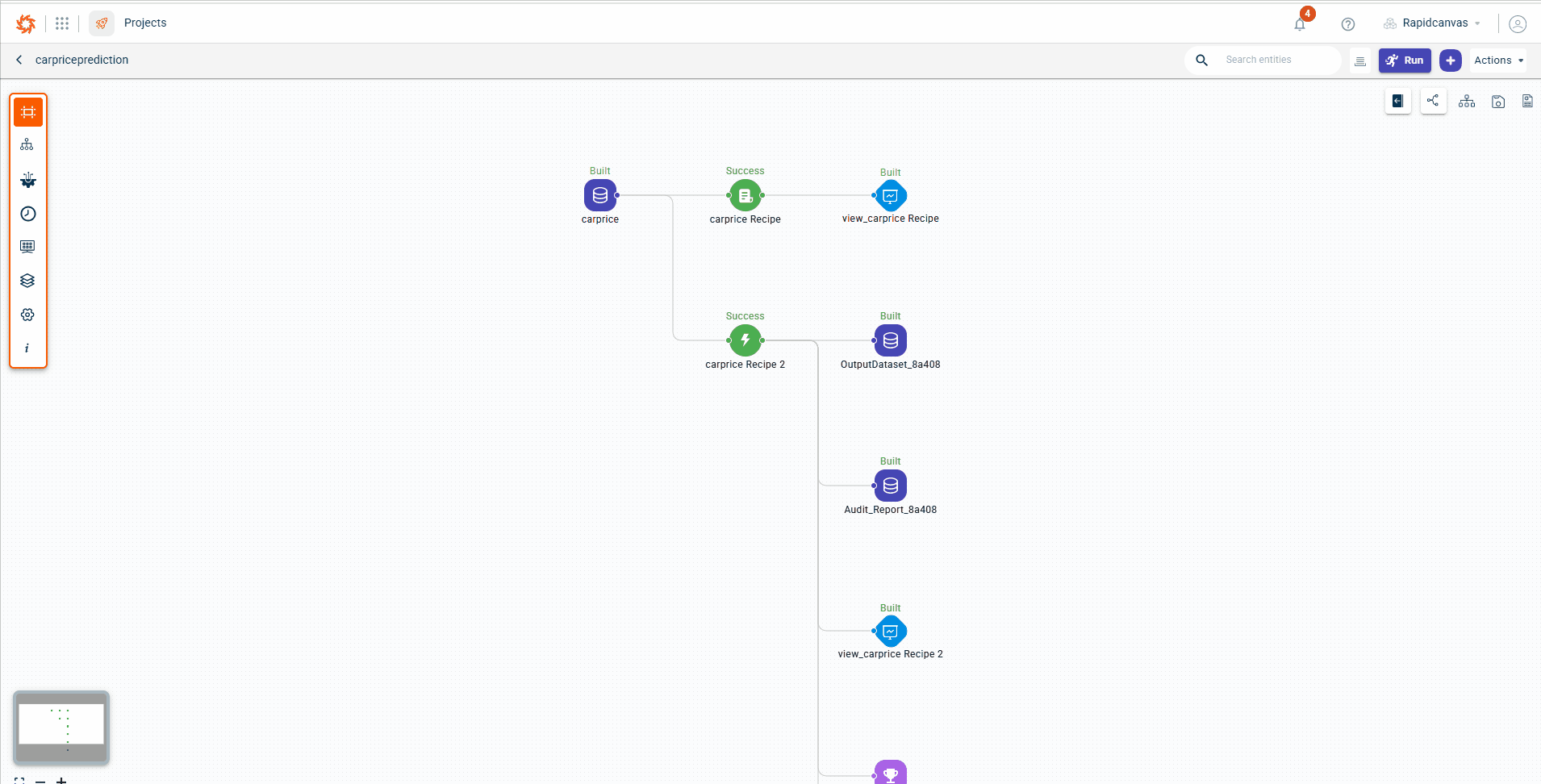 Canvas is a workspace where you can create flows or machine learning models by importing datasets and adding recipes. After you create a project, you will be navigated to the Canvas where you can create, test, and train models using various recipe types. There are predefined templates available for data cleaning, data preparation, data analysis, feature engineering, model building, model prediction, and visualization. Specifically, the AI-assisted recipe enables you to provide the text prompt to generate the code recipe in seconds and use it in the pipeline. You can use a rapid canvas recipe to run end-to-end ML flow automatically by uploading a dataset.