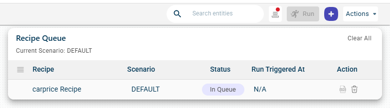 When triggering multiple recipes on the canvas, subsequent recipes are queued if the first recipe run is in progress using the queuing recipe feature. For the first recipe, you can view the run option. In case, you want to run a series of other recipes on the canvas, you can right-click on the desired recipe to see the Add to Queue option. Clicking this option will add the recipe to the queue.