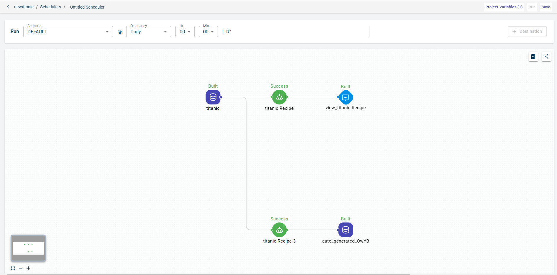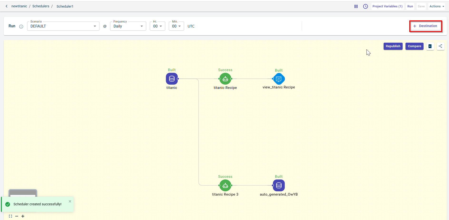 Click Save to create the scheduler. This also enables the +Destination option to configure the data connector to which you can publish the generated output datasets or the input dataset.