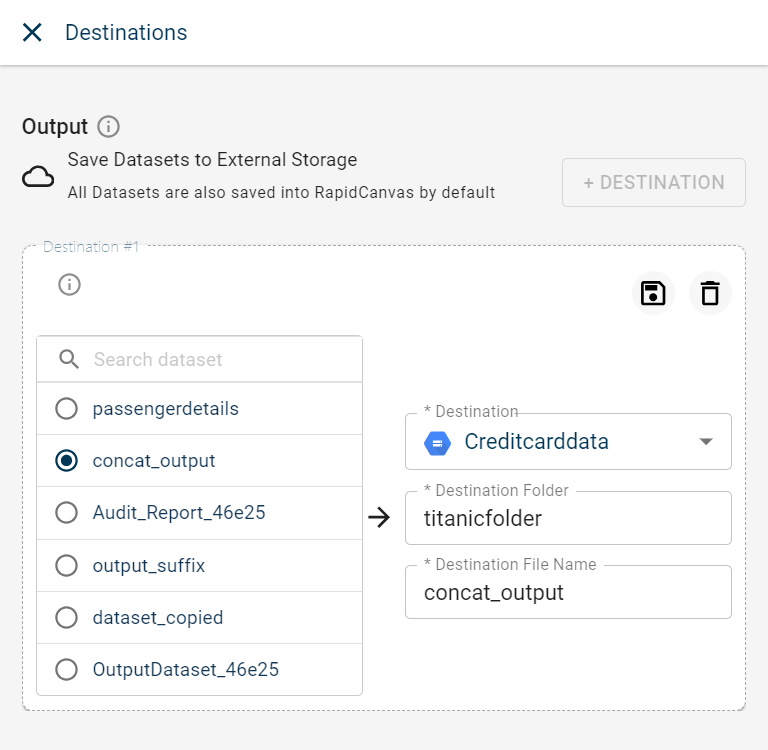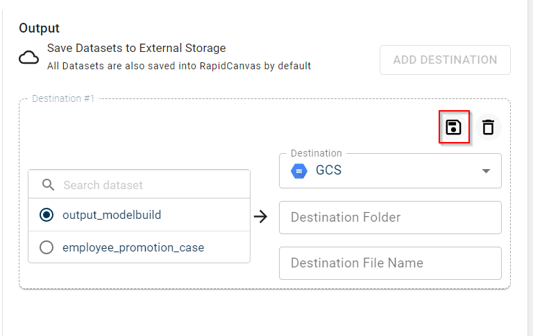 If you no longer want to save the output to the configured destination, you can use the delete icon to delete the destination.