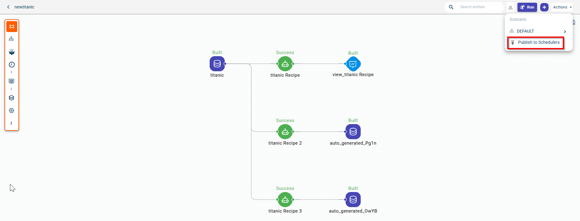 Use this procedure to republish the data pipeline to schedulers. When you update the dataset, delete a recipe or add a new recipe to the data pipeline, you can republish the new flow to scheduler using the republish option on the canvas. This updates the canvas on the selected schedulers.