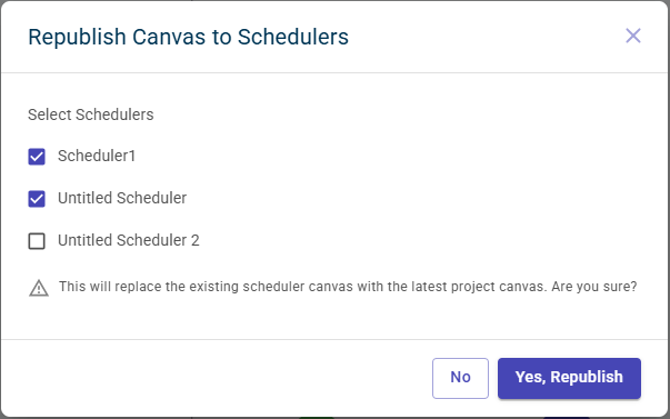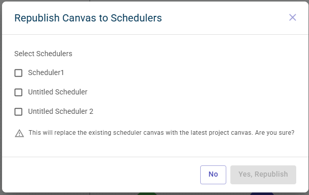Click the Actions drop-down and select Publish to Schedulers on the canvas. This displays Republish canvas to schedulers dialog.