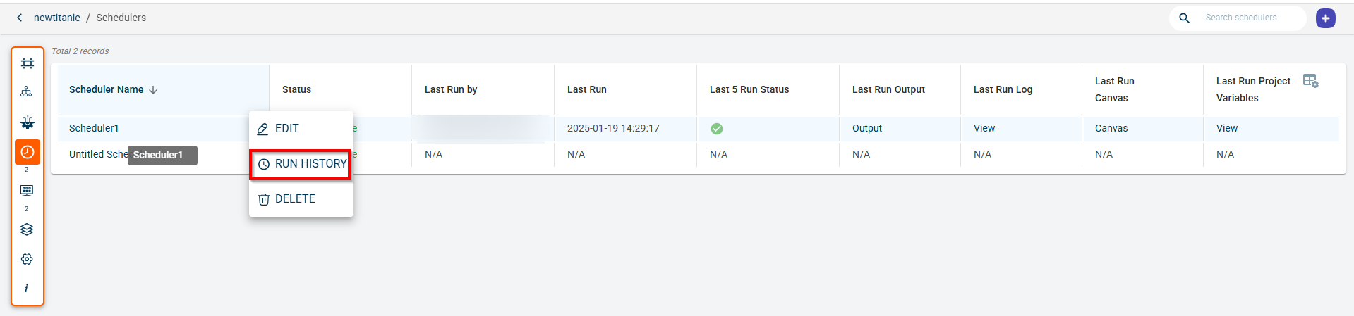 Click the ellipses icon in the Job Name column and select the RUN HISTORY option to view the list of completed scheduler runs for the selected scheduler.