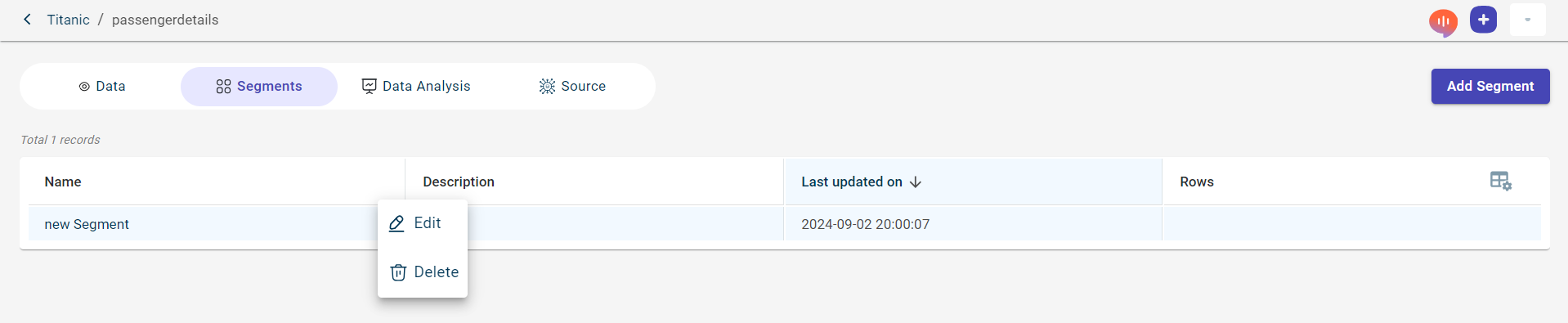 delete a segment, using the Delete option corresponding to the segment you want to delete.