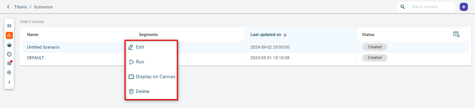 Select the project in which you have created the scenarios. You are redirected to the Canvas page.