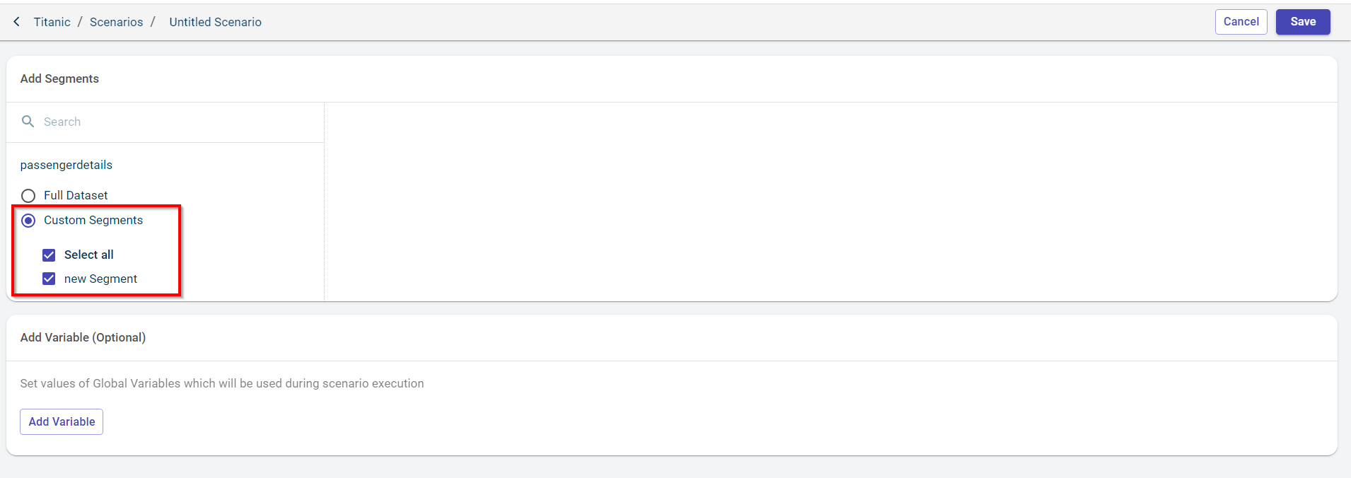 If there are multiple custom segments, you can select the check box corresponding to the segment you want to add to the scenario.