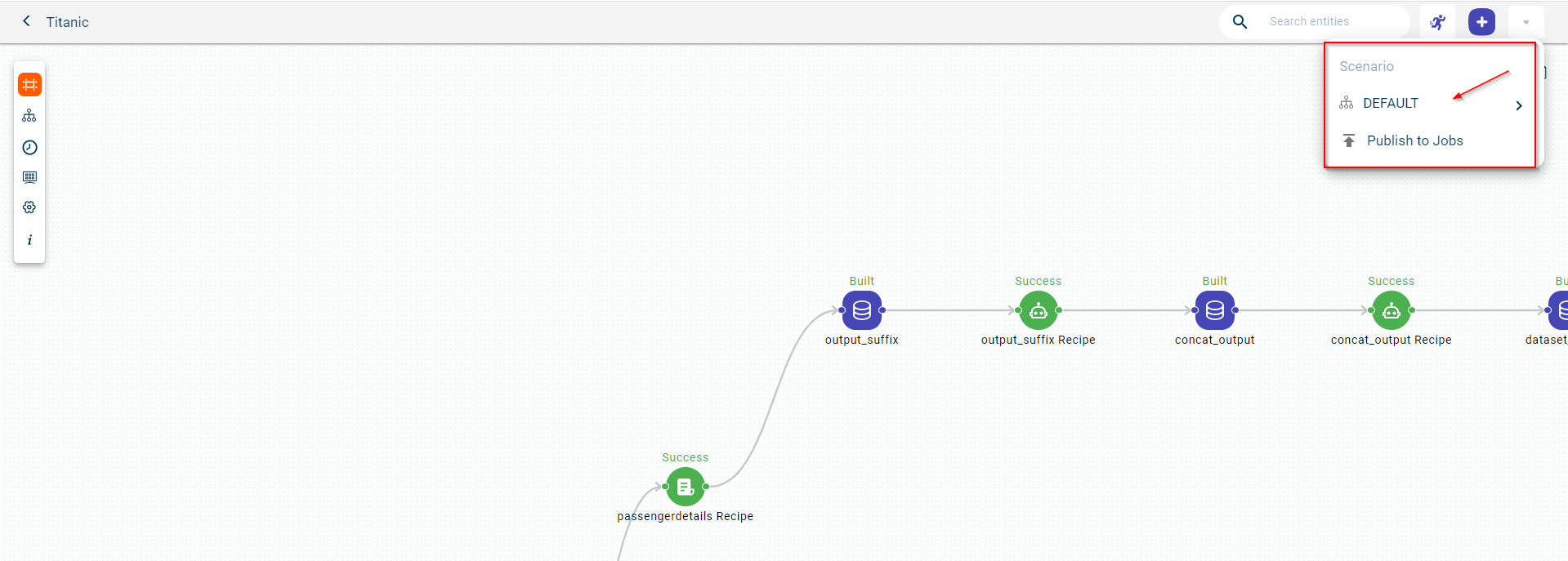 Click the caret icon and click on DEFAULT to see the scenarios created for this project. You can select the scenario for which you want to execute the data pipeline.