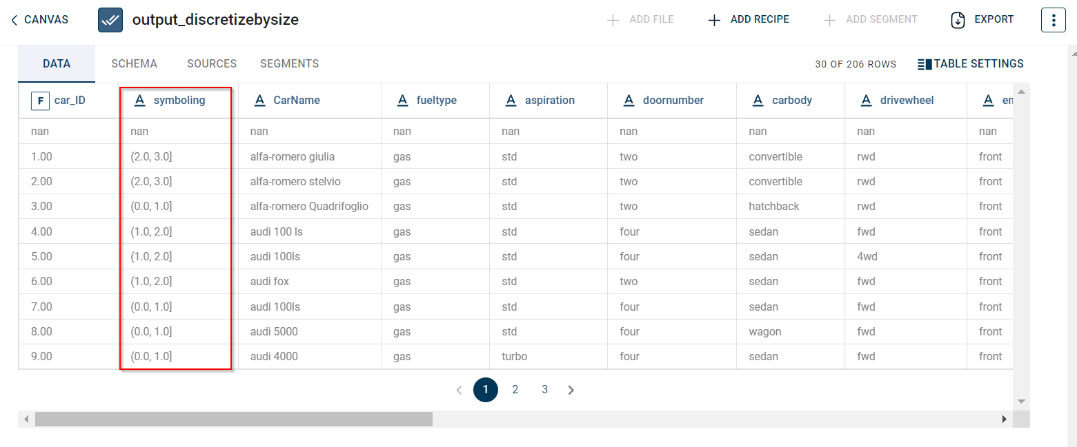 The output after running the Discretize by Size transform on the dataset appears as below: