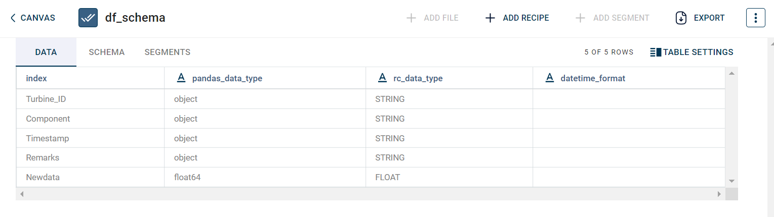 This transform allows you to check the data type of all columns in a dataset. It returns two columns displaying how each type of column data is stored in Pandas and in the platform database.