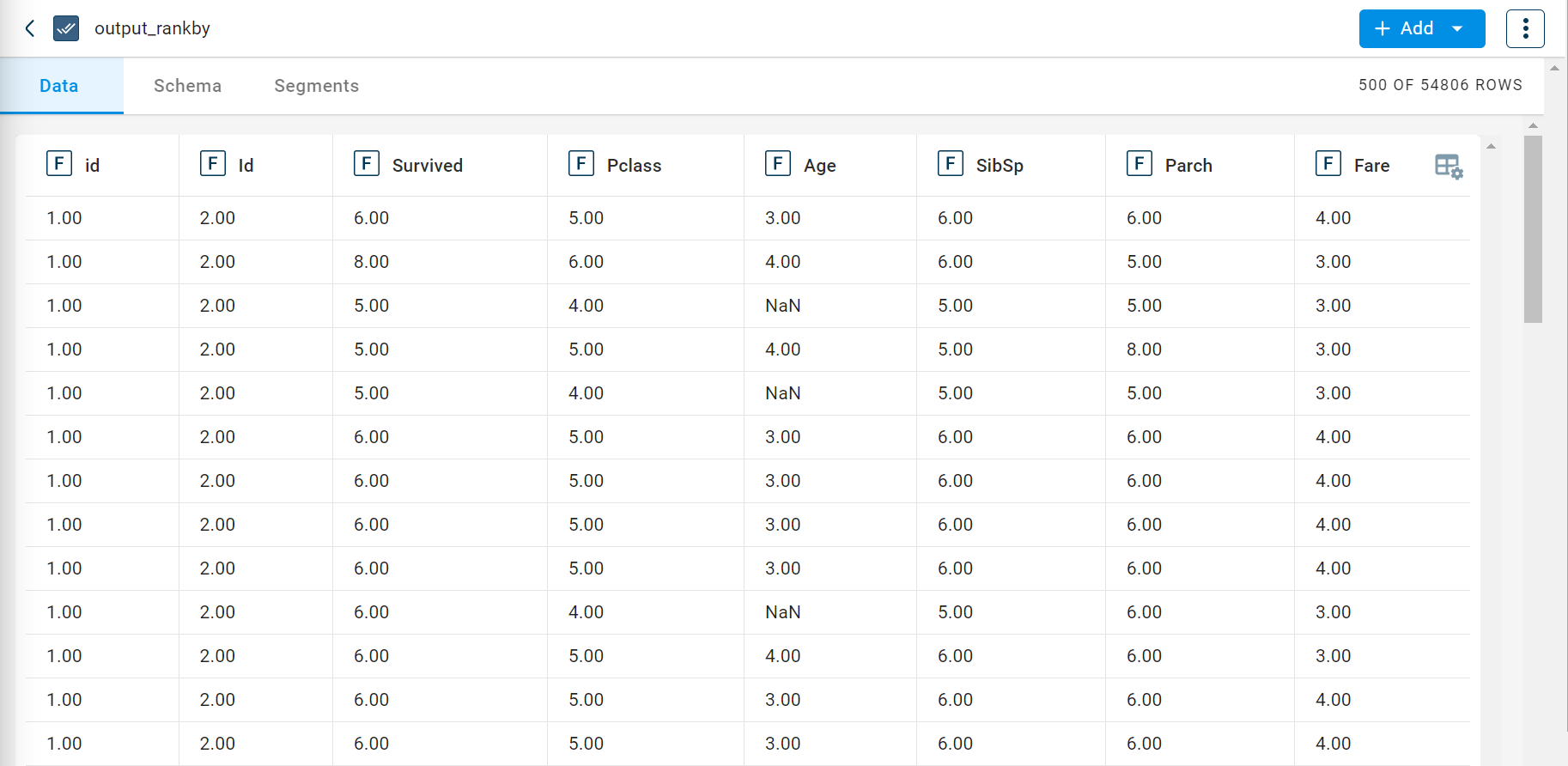 The output after running the Rank By transform on the dataset appears as below: