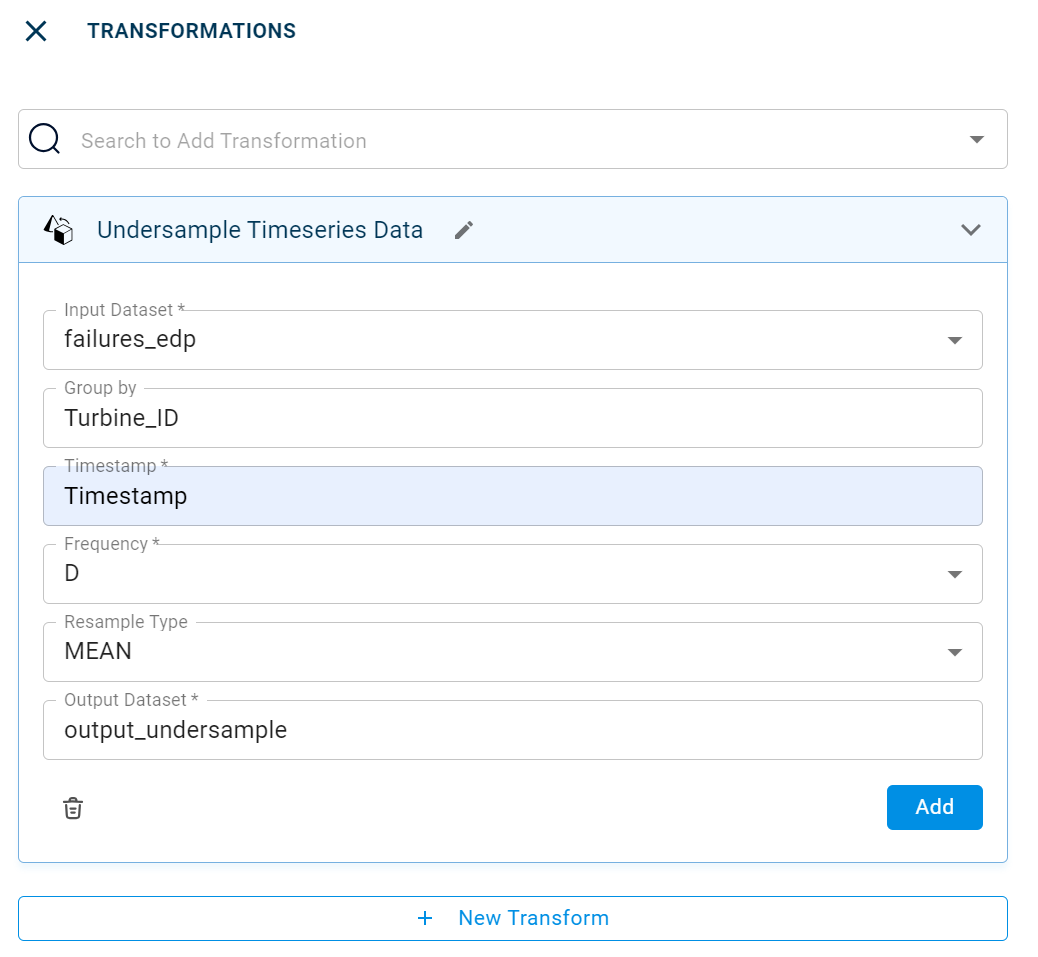 This transform reduces the data collected over time and retains the general pattern of the data by allowing users to aggregate values based on the frequency, which can be by hour, week, month, or year. One of the aggregation methods, such as mean, max, min, or median, is applied to the numerical value column of the grouped data.