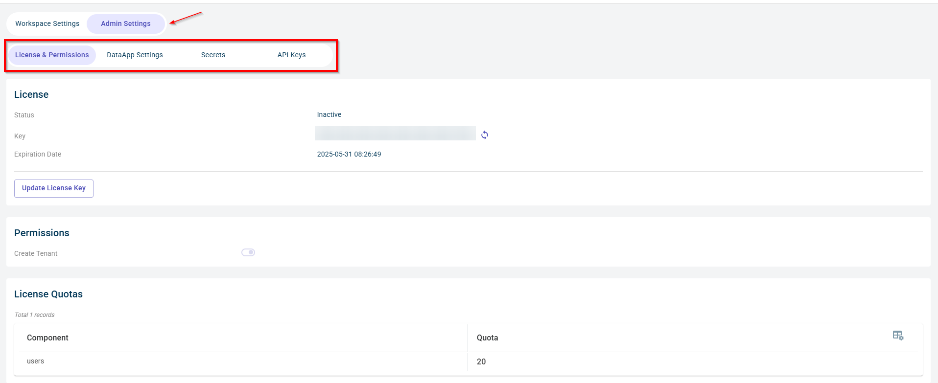 Admin settings - You can update the license key, change the DataApp settings and view the license quotas. For more information, see Admin settings.