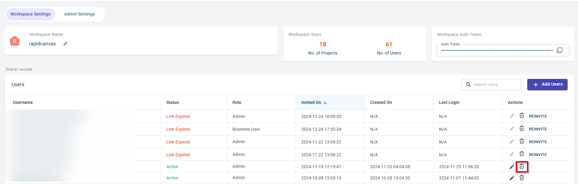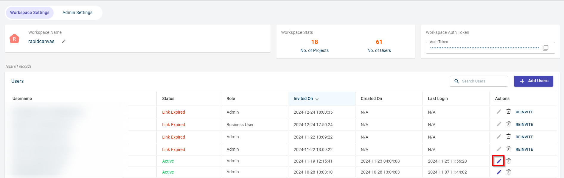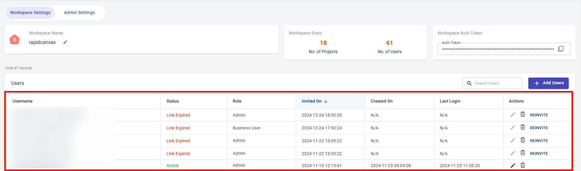 Click the REINVITE button to resend an invitation to the user for joining the platform or workspace. This option appears only if the user’s original invitation link has expired.