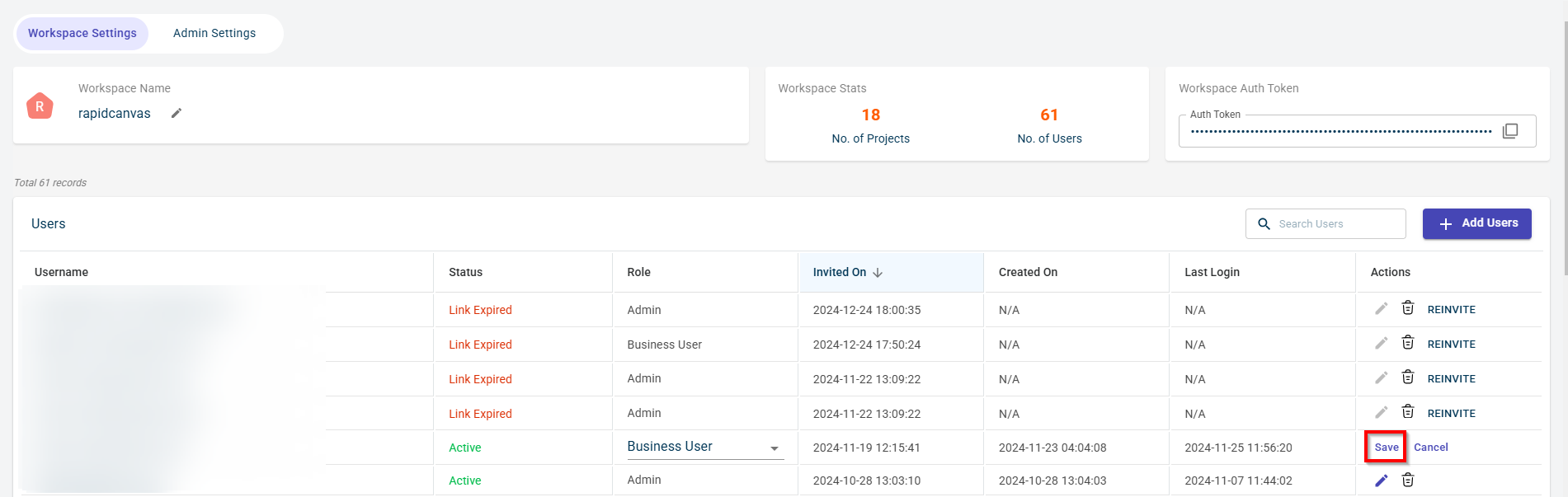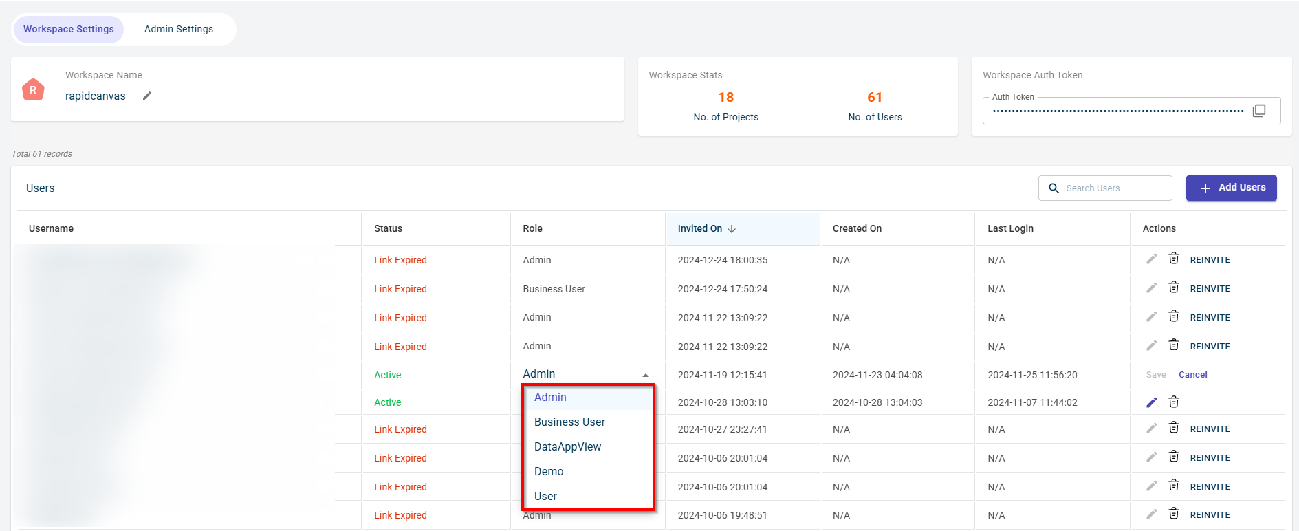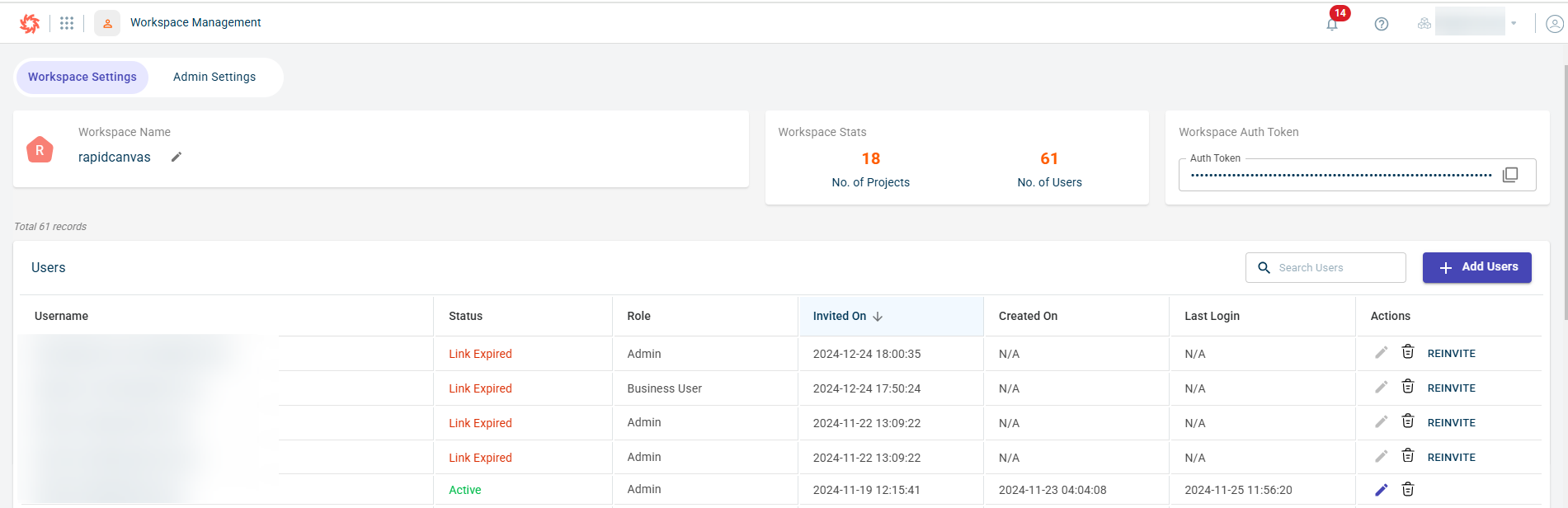 Click the REINVITE button to resend an invitation to the user for joining the platform or workspace. This option appears only if the user’s original invitation link has expired.
