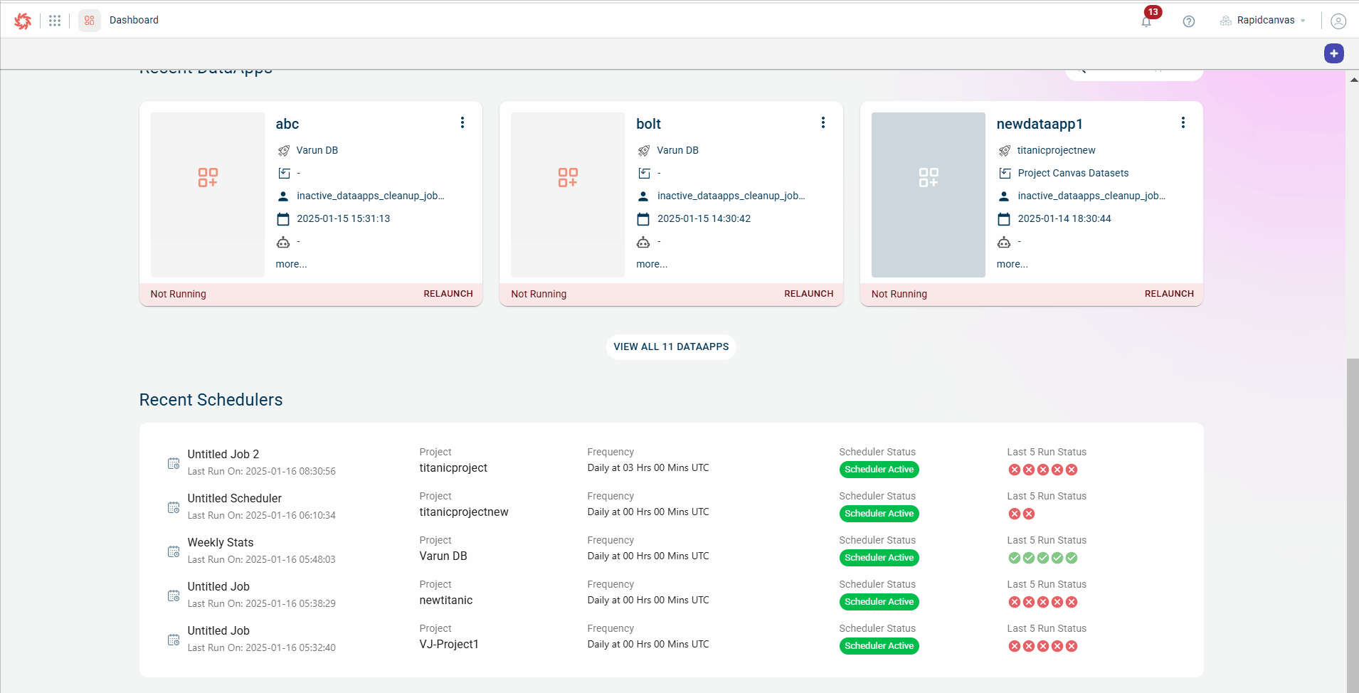 A role in the RapidCanvas platform defines the specific actions a user can perform and the features they can access. Roles are designed to ensure that users have the appropriate level of access based on their responsibilities and requirements. The platform provides four predefined roles: Admin, DataApp-View, User, and Business User. Each role is configured with distinct permissions to streamline workflows, maintain security, and prevent unauthorized access.