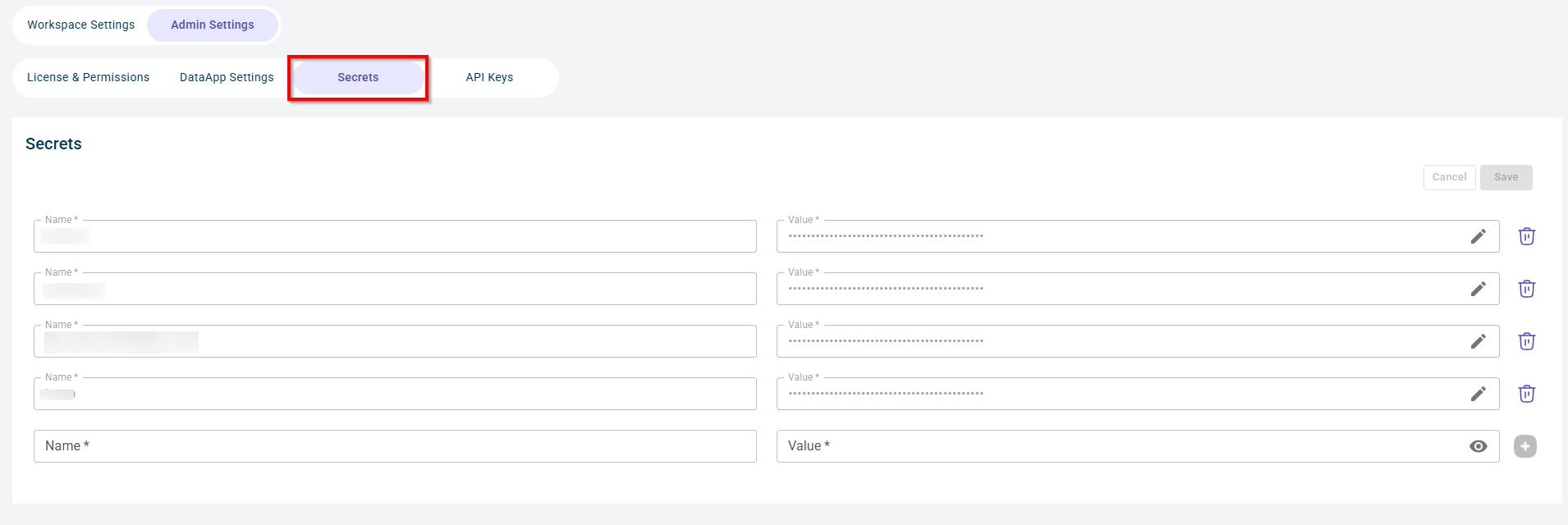 Click the Secrets tab to configure secrets by providing the Name and Value in the respective fields, then click Save. You can add as many secrets as you want here. The configured secrets can be used in the helper functions of AskAI. You can also modify the secret key values at a later time, using the Edit option.