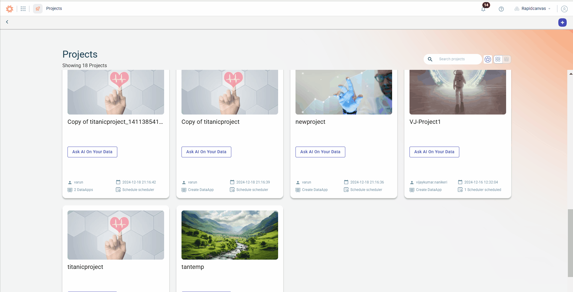 RapidCanvas platform supports multiple workspaces. Each workspace operates independently, ensuring complete isolation from others. Users and projects within a workspace are restricted to that specific workspace, and projects from one workspace cannot be viewed or accessed by another. For users with access to multiple workspaces, projects and associated resources—such as DataApps, environments, and prediction services—can be copied between workspaces, provided the necessary permissions are in place.